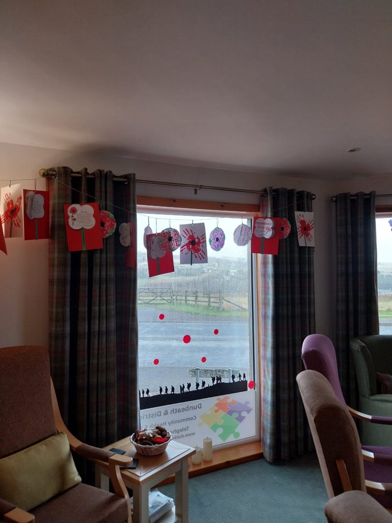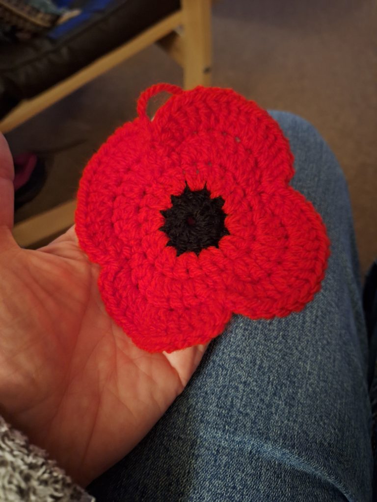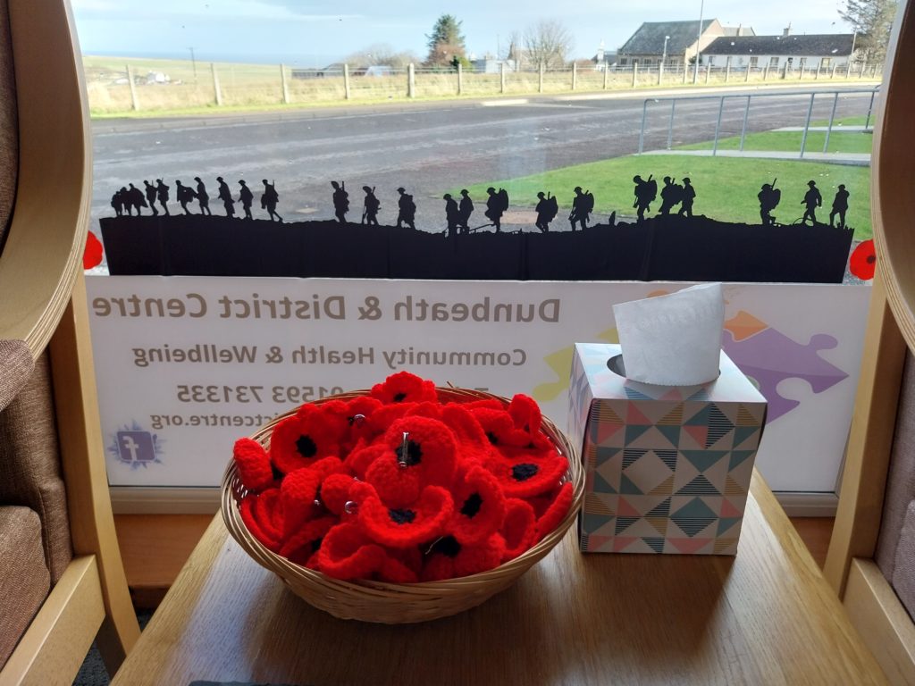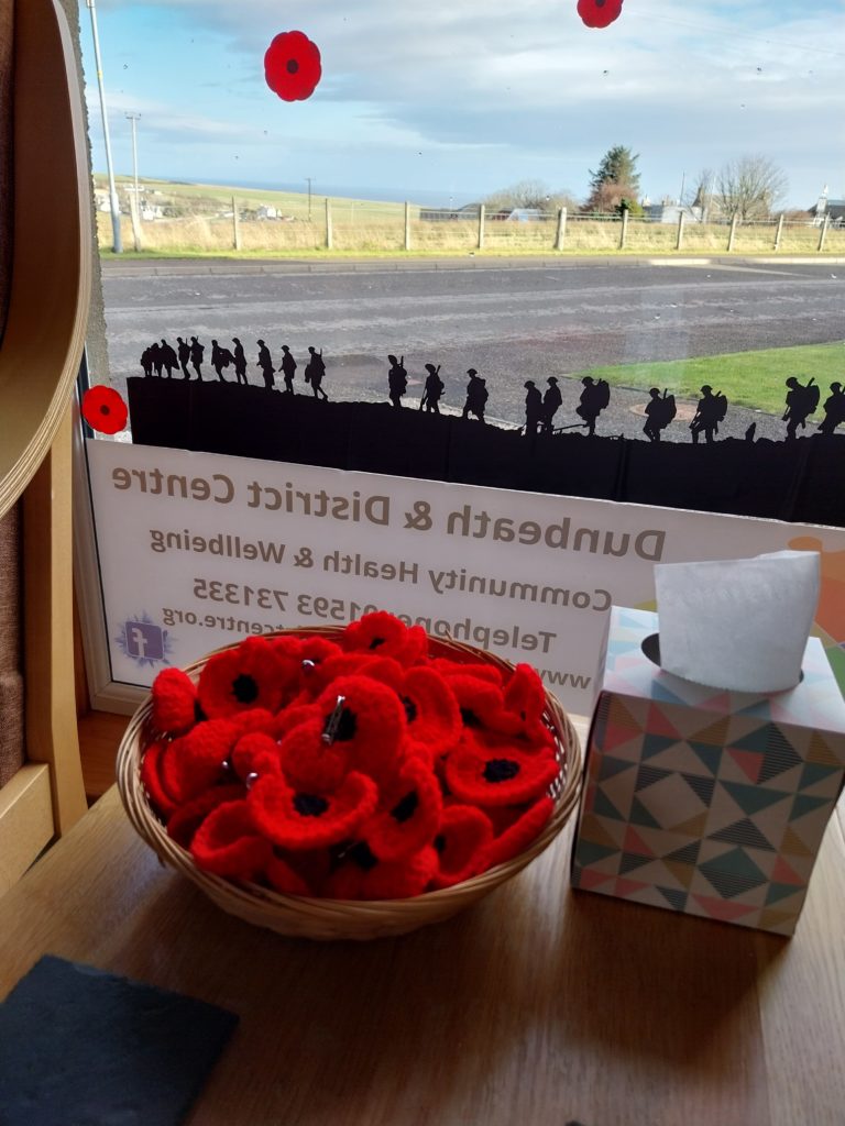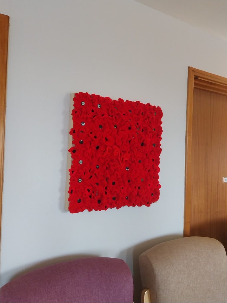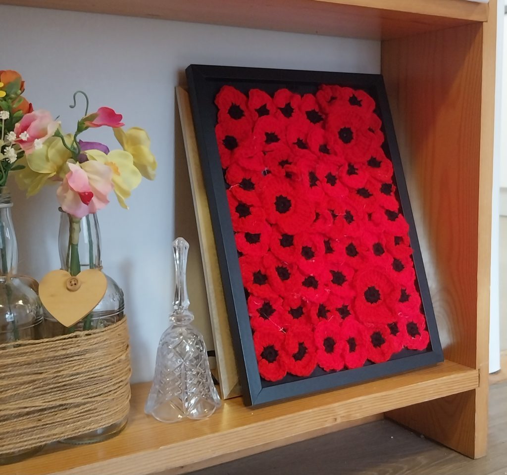 Our goal was to create a display of knitted and crocheted poppies to brighten up our centre and give a memorial for any who put in their services.