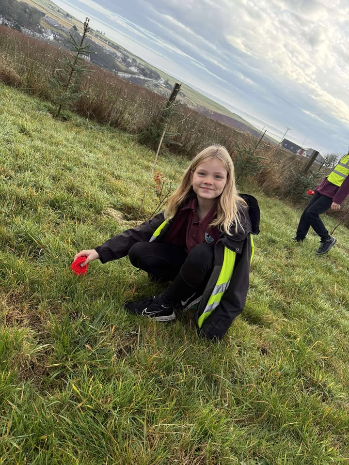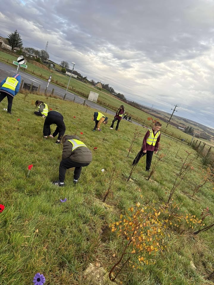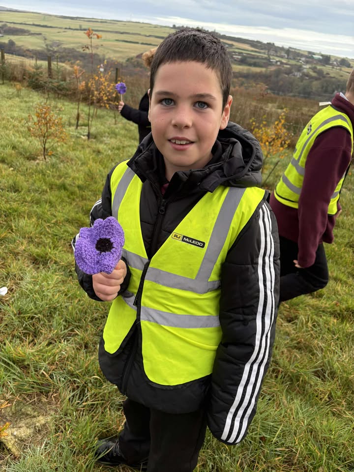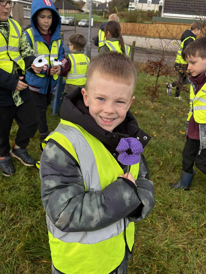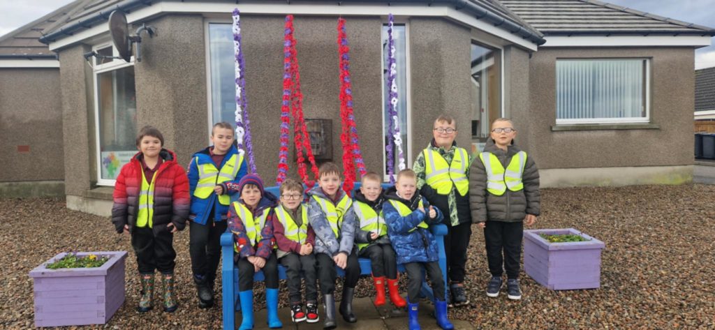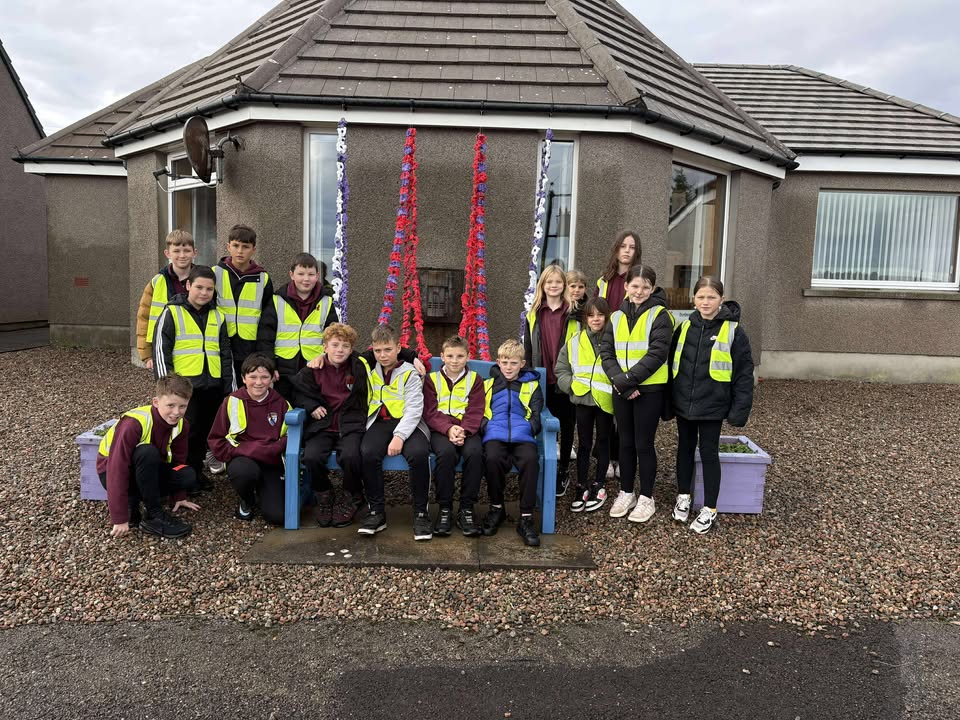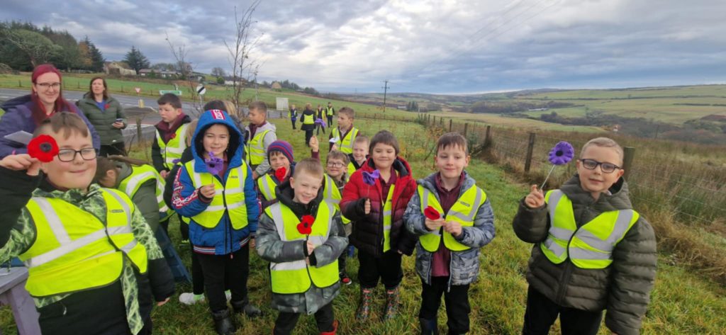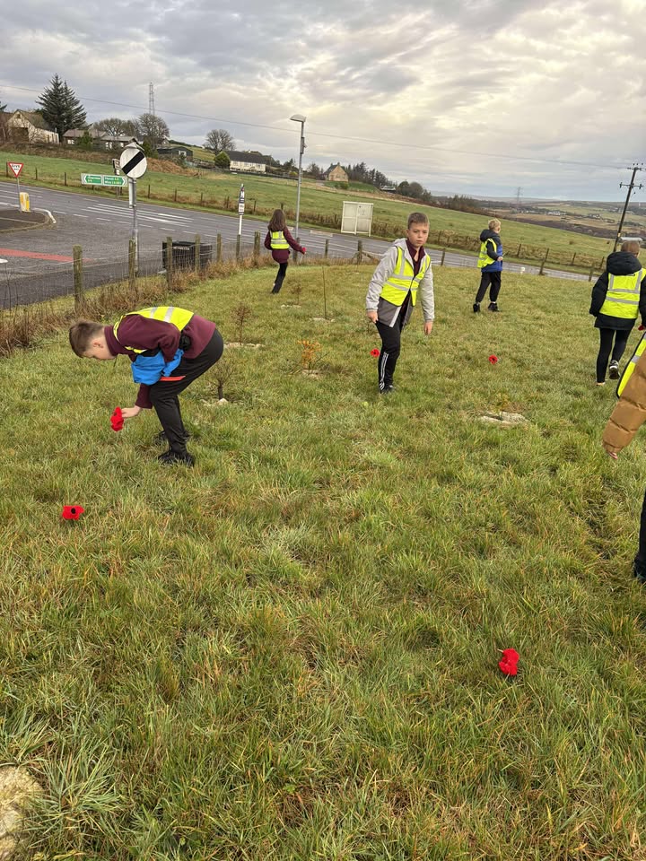 Then we have our incredible team of little helpers, our hot gluing efforts gave us 90 poppy pegs to put into the ground at the memorial garden across the way, and to save our spines from breaking popping them in one by one we asked the excellent staff at Dunbeath Primary School if we could borrow their finest workers (our wonderful local students) for a hard morning of construction.