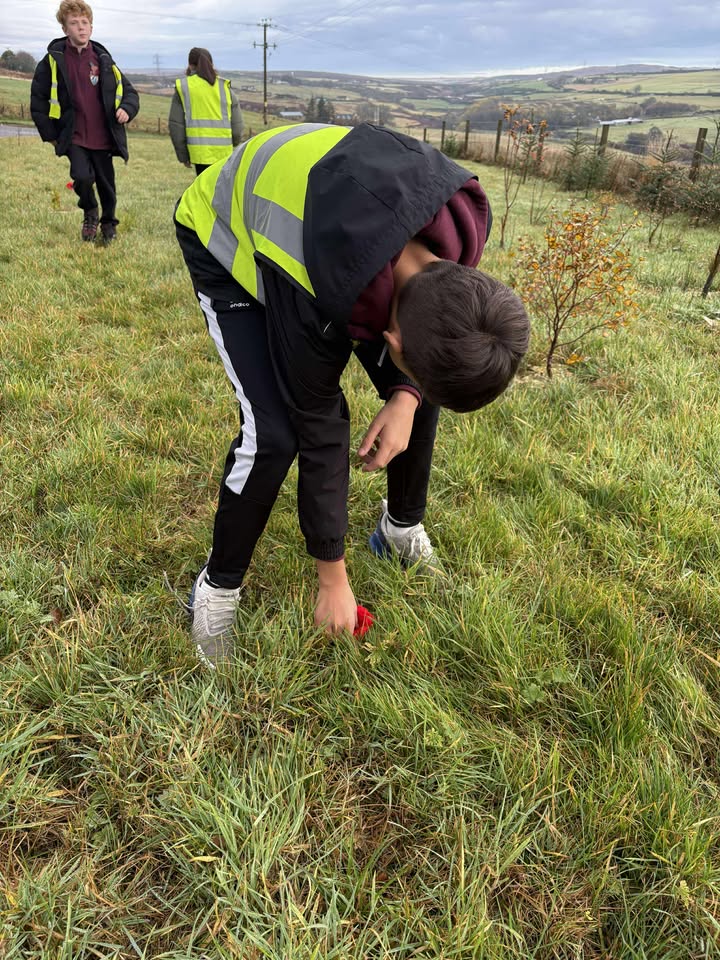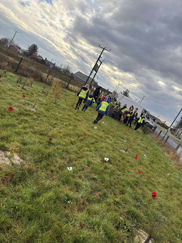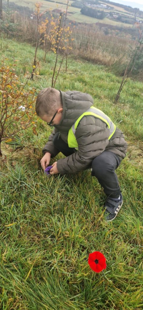 And by that we of course mean we asked very nicely if they would like to run riot and pop our tent pegs in the ground to brighten the memorial garden up for winter, and we were incredible lucky they said yes. So wrapped up for the mild November weather they grabbed a poppy at a time and filled up each bit of ground with colour and memory. They had clearly been working hard at learning about remembrance as they all told me what each poppy stood for and what remembrance was about.